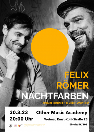 Felix Römer schreibt Gedichte. Das hat dazu geführt, dass ereinerseits deutschsprachiger Meister im Poetry Slam war und andererseits seine Texte in verschiedensten Zusammenhängen in die Öffentlichkeit brachte. Nun geht Römer mal wieder neue Wege. Während der letzten Jahre und zwischen allen Restriktionen, mit denen die Kulturszene umgehen musste, arbeitete Felix Römer daran, seine Texte musikalisch zu vertonen. Zusammen mit der Band Nachtfarben um den Musiker Martin Bosch wurde das, was bereits ohnehin zur Bühne drängte, so arrangiert, dass daraus ein vielschichtiges, klangreiches und packendes Programm entstand. Jazzige Sphären sowie eingängige Pop-Linien, rhythmische Arrangements treffen Poesie und wandeln sich unversehens zu Soundscapes, durch welche Römers Verse leiten. Es entstehen Stücke, die sich maßgeschneidert um die sonore, warme Stimme Römers legen. Dabei greifen die musikalische Durchtriebenheit von Nachtfarben und die Unbefangenheit Römers perfekt ineinander.